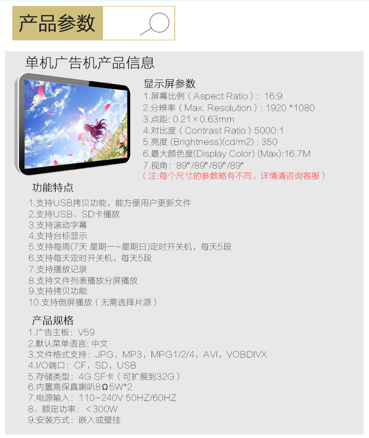 - 安裝方式:落地式豎屏安裝